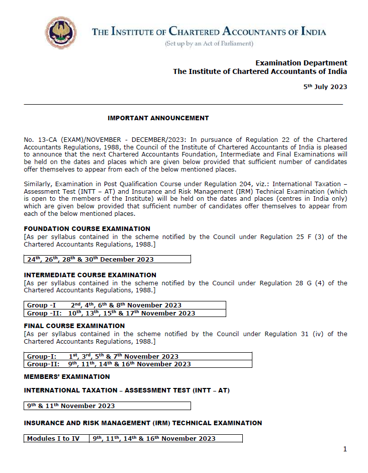 The CA Inter Nov 2023 examinations are scheduled as follows: