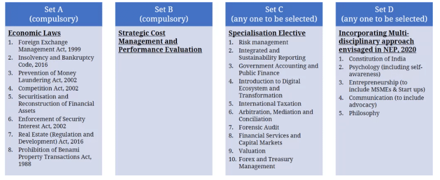 Under the CA new course 2023, ICAI will introduce self-paced modules which are divided into four sets. Students are required to complete all these sets at their own pace and have to give online exams and score at least 50% marks in each of them to become eligible for CA final level.