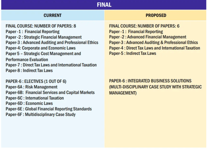 The CA final papers count will reduce from 8 to 6 from CA final syllabus in the CA Final new course. Now both CA final-level groups will include the 3 papers each.
